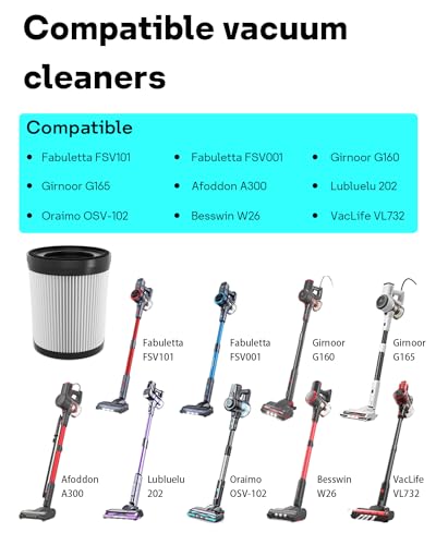 COMPATIBILITY: This filter is perfectly compatible with several popular cordless stick vacuum cleaners, including the Fabuletta FSV101 & FSV001, Girnoor G160 & G165, Lubluelu 202, Oraimo OSV-102, Besswin W26, VacLife VL732, and Afoddon A300. You can use it with confidence.
