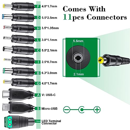 Enhance the versatility of your electronics with 11 interchangeable DC plug tips. These include LED Terminal Connector, USB-C, Micro USB, and various other connectors like 6.33.0 mm, 5.52.5 mm, 5.52.1 mm, 4.81.7 mm, and 4.0*1.7 mm.
